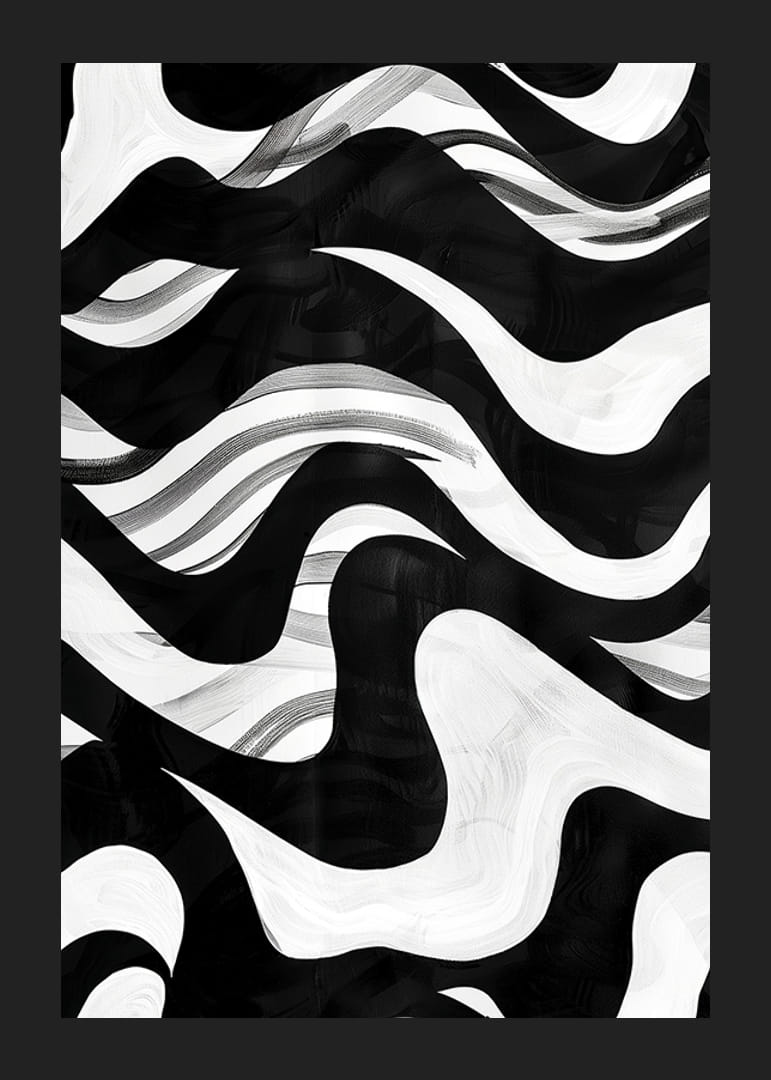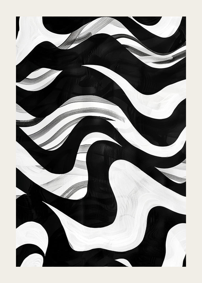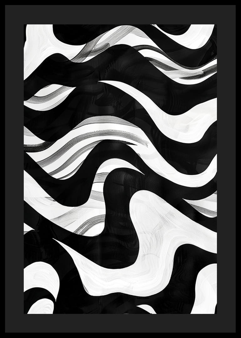 Tämä juliste vangitsee silmät laajalla mustavalkoisilla aalloillaan, jotka liikkuvat kuin harmoninen sinfonia. Abstrakti aihe tuo mieleen ikuiset merivirrat ja hypnotisoivan liikkeen.