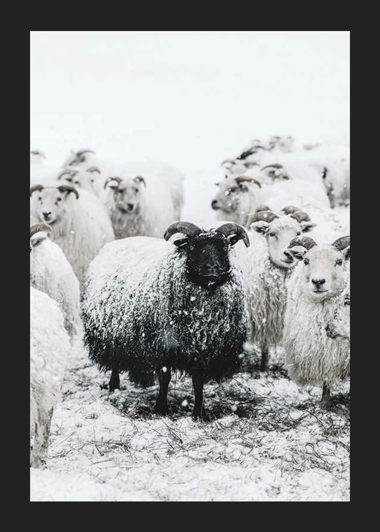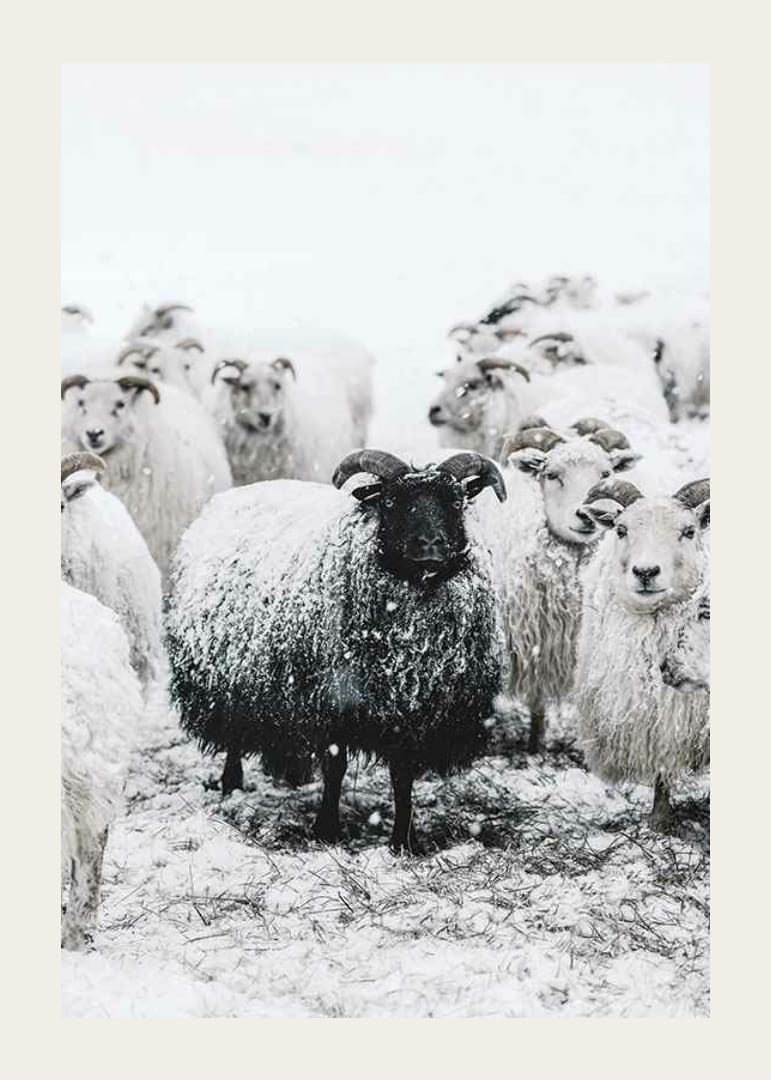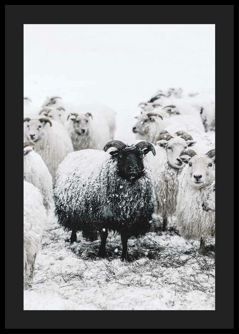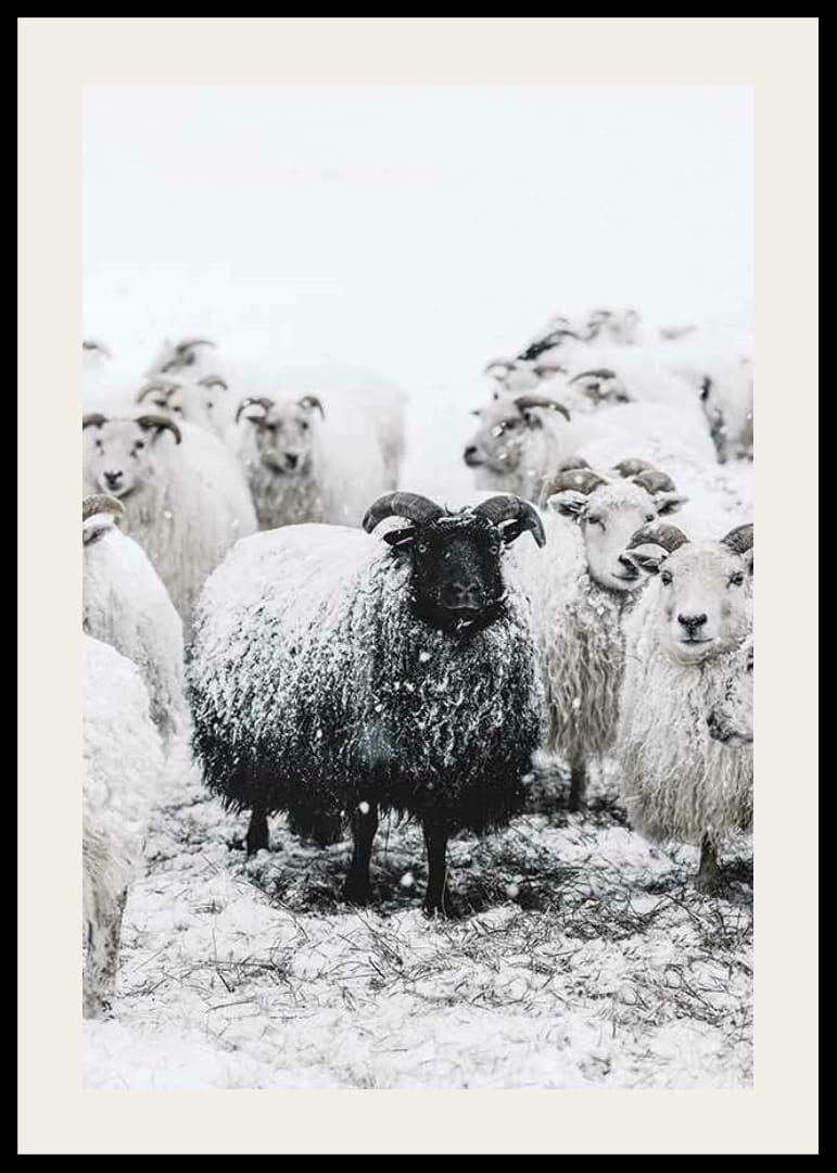 Musta lammas seisoo valkoisten lampaiden ympäröimänä talvisessa lumimaisemassa. Tumman villan ja lumipeitteisten eläinten välinen kontrasti luo selkeän keskipisteen aiheen keskelle. Neutraalit harmaan ja valkoisen sävyt antavat julisteelle tyylikkään ja luonnollisen tunnelman, joka sopii hyvin sekä olohuoneisiin että eteisiin.