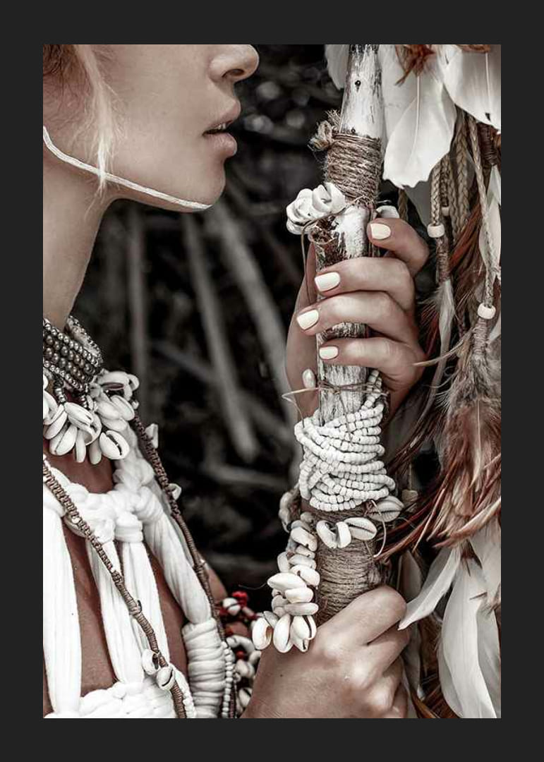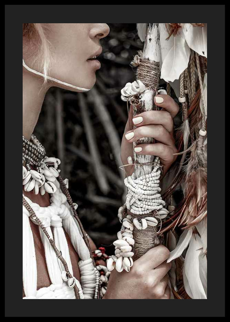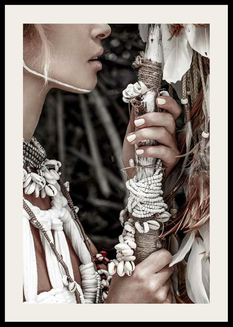 Yksityiskohtainen lähikuva naisesta perinteisessä asussa, jolla on simpukoista, helmistä ja punotuista nauhoista tehty kaulakoru. Hän pitelee sauvaa, joka on koristeltu valkoisilla nauhoilla ja luonnonhöyhenillä. Hillitty beigen ja ruskean värimaailma antaa luonnollisen vaikutelman. Tämä juliste tuo tyylikkään silauksen esimerkiksi olohuoneeseen tai makuuhuoneeseen.