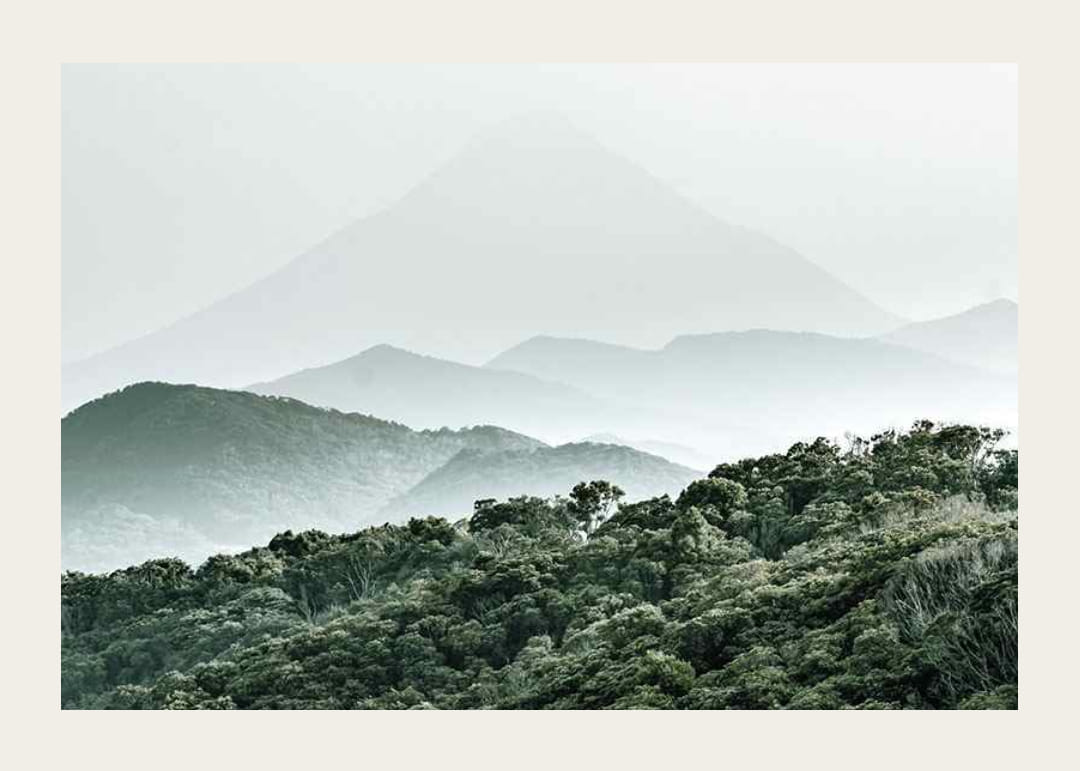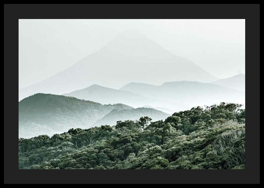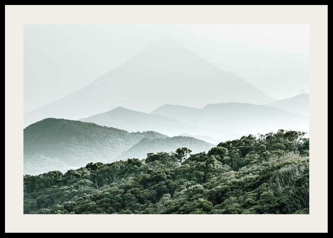 Tiheä vihreä metsä levittäytyy useiden sumun peittämien vuorten eteen hillityissä vihreän ja harmaan sävyissä. Haalistuneet ääriviivat ja pehmeä valo antavat aiheelle rauhallisen syvyyden. Tämä juliste sopii täydellisesti huoneisiin, joihin haluat luoda rauhallisen ja luonnollisen tunnelman, kuten olohuoneeseen, makuuhuoneeseen tai työhuoneeseen.