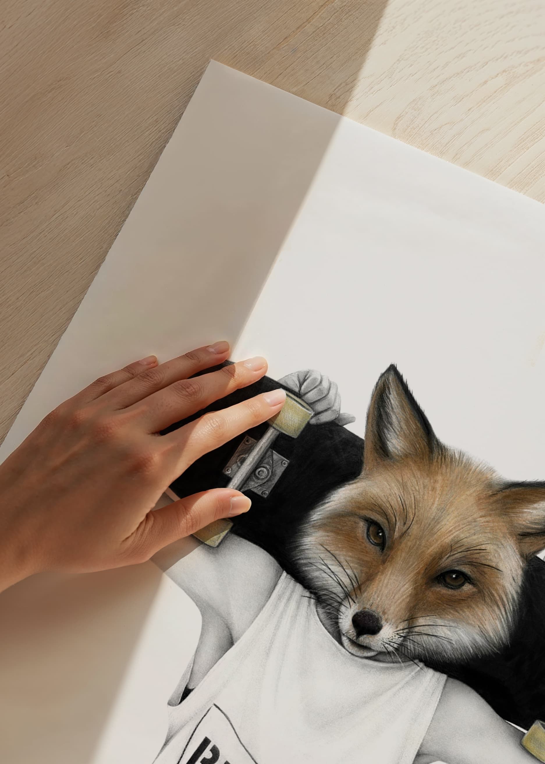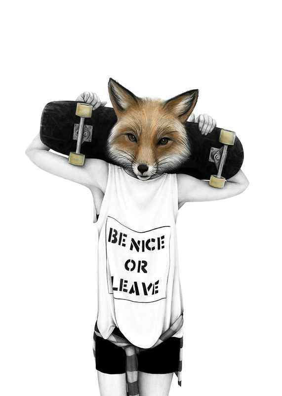Seisova, ihmisvartaloa poteva kettu pitää rullalautaa kaulassaan ja hänellä on valkoinen t-paita, jossa lukee "Be nice or leave". Yksityiskohtainen mustavalkoinen piirros, jossa on luonnolliset ketun värit kasvoilla, antaa aiheelle leikkisän mutta tyylikkään tunnelman. Surrealistisella huumorilla ja ominaisella yksityiskohtaisella lyijykynätyylillään ruotsalainen kuvittaja yhdistää klassista taidetta moderneihin elementteihin ja luo odottamattoman kontrastin eläinaiheiden ja arjen välille. Juliste sopii nuorten huoneisiin tai moderneihin ympäristöihin, joissa on henkilökohtainen kosketus.