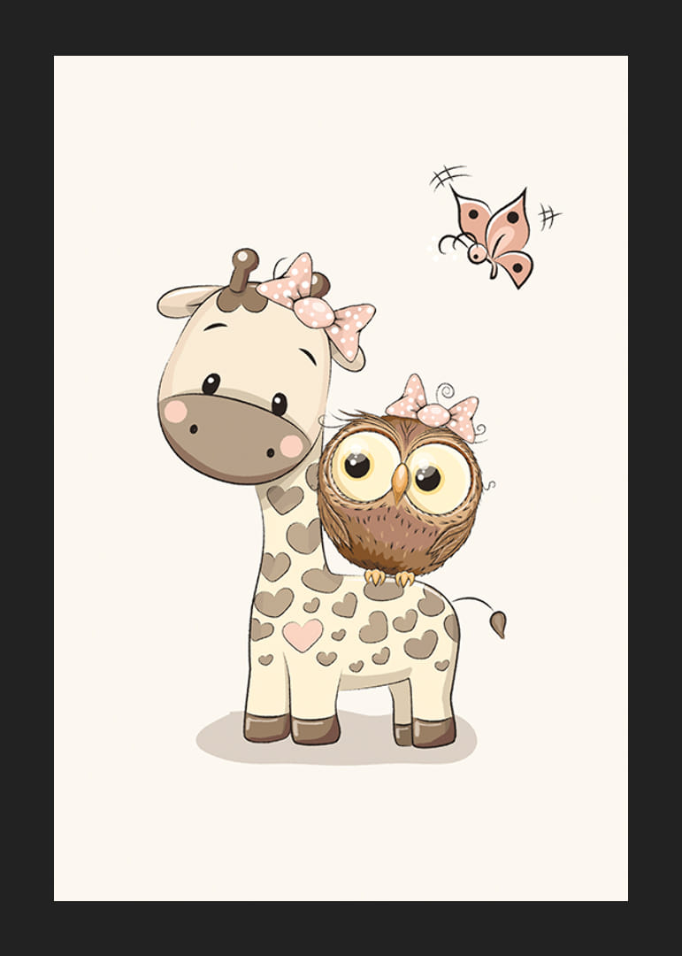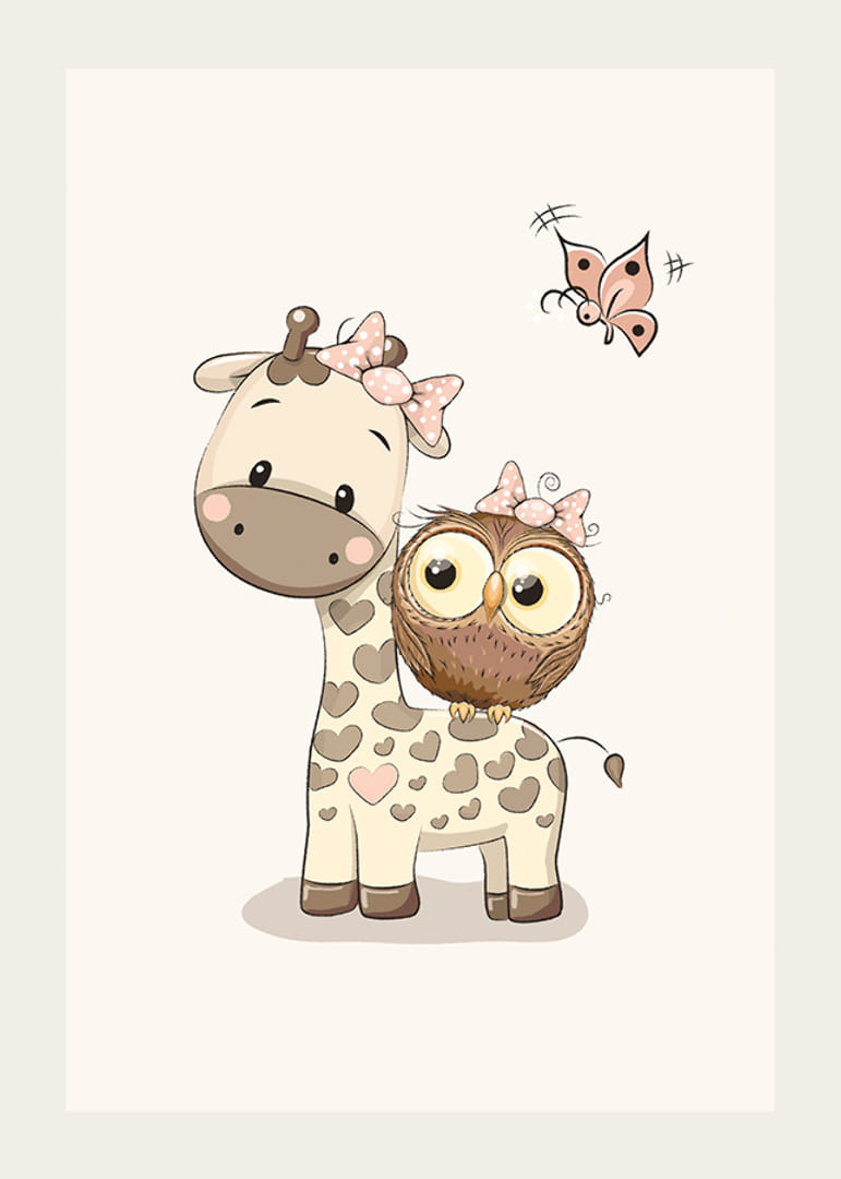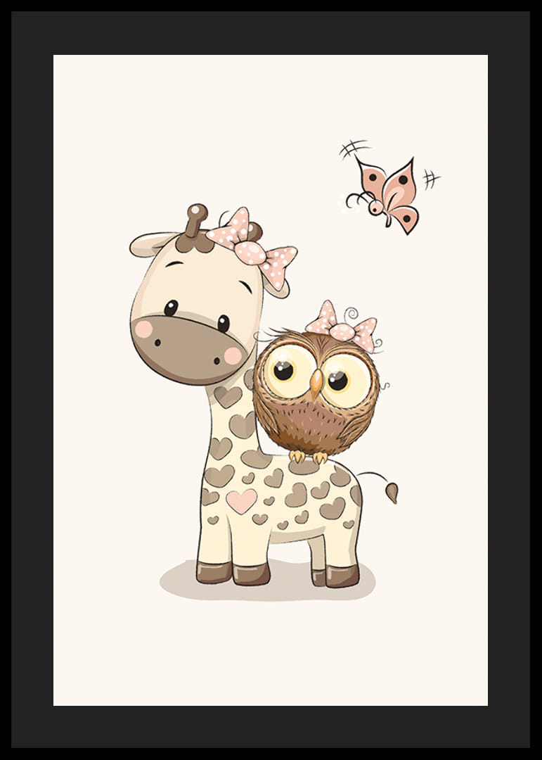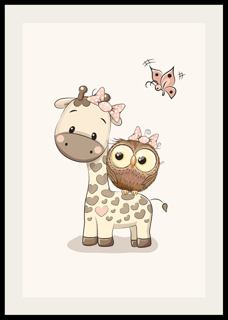 Sydämenmuotoisilla täplillä ja vaaleanpunaisella pilkulla koristellun rusetin omaavan kirahvi seisoo suurisilmäisen ja samankaltaisen rusetin omaavan pöllön vieressä, ja perhonen leijuu niiden yläpuolella. Pehmeät beigen ja ruskean sävyt luovat lämpimän ja leikkisän tunnelman. Tämä juliste sopii täydellisesti lastenhuoneisiin ja kohottaa tunnelmaa ystävällisellä aiheellaan.