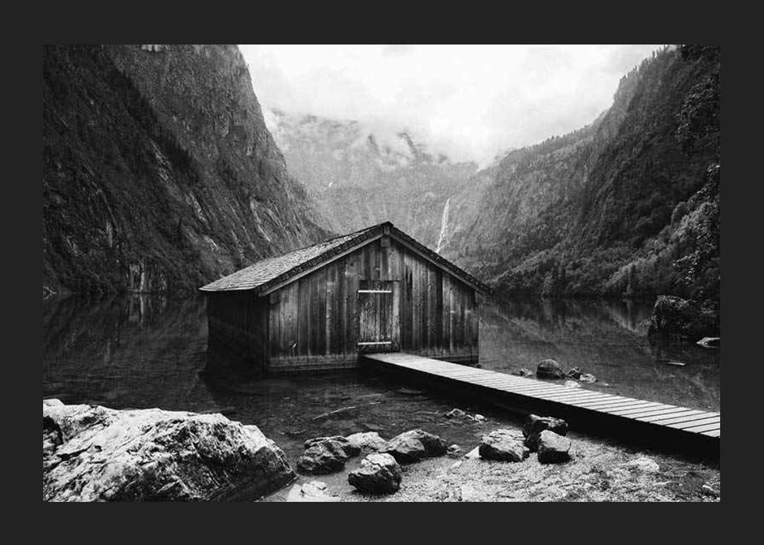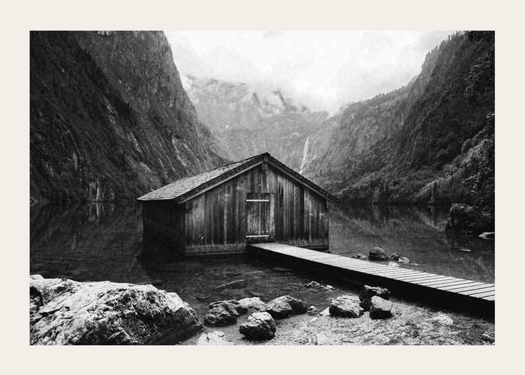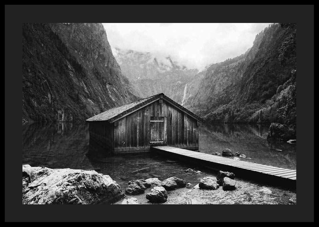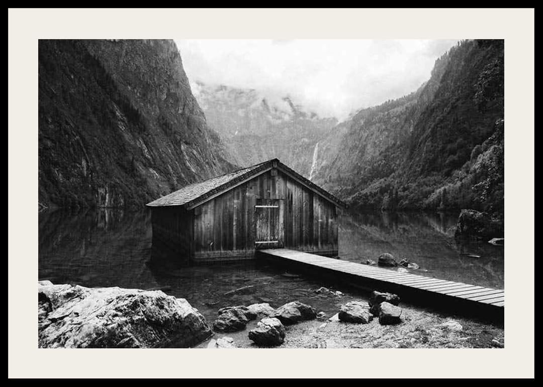 Yksinkertaiset linjat ja luonnonmateriaalit leimaavat aihetta, jossa pieni puinen mökki lepää paalujen päällä Oberseen vedessä. Ympäröivät vuoret heijastuvat tyynestä järvestä, ja kaukaisuudessa näkyy himmeä vesiputous. Mustavalkoinen värimaailma antaa julisteelle ajattoman ilmeen ja sopii sekä moderneihin että klassisiin sisustuksiin.
