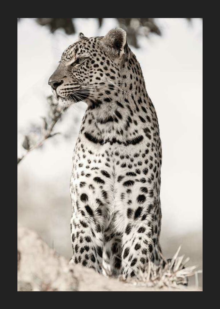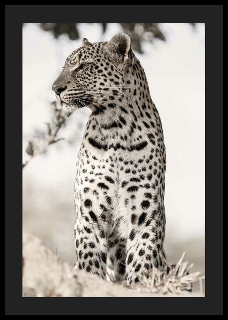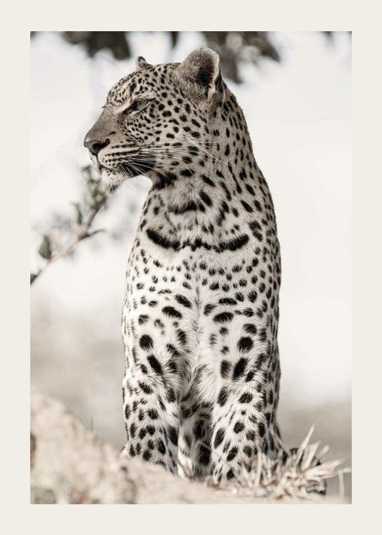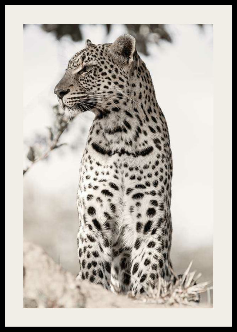 Leopardi profiilissa, jolla on selkeä, täplikäs turkki, istuu koholla kuivien ruohotuppojen keskellä. Yksityiskohtainen valokuva pehmeällä, vaalealla ja sumealla taustalla, joka korostaa eläimen muotoja. Luonnolliset beigen ja mustan sävyt antavat julisteelle rauhallisen ja hienostuneen ilmeen, joka sopii olohuoneisiin ja työhuoneisiin.