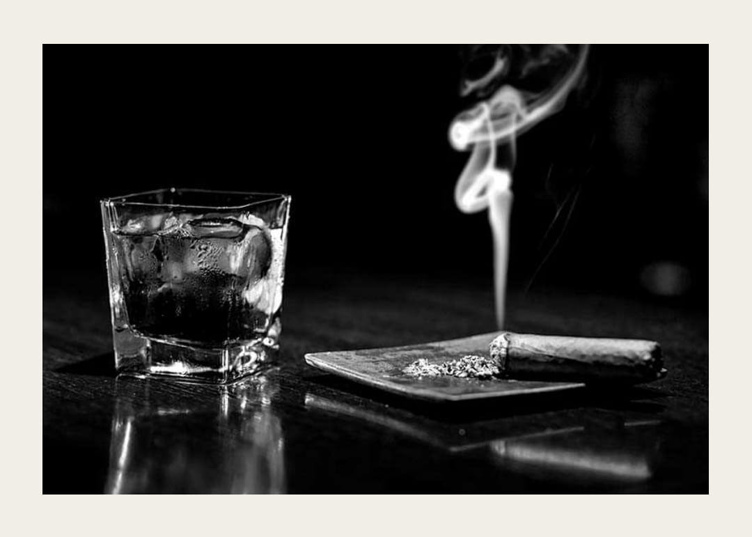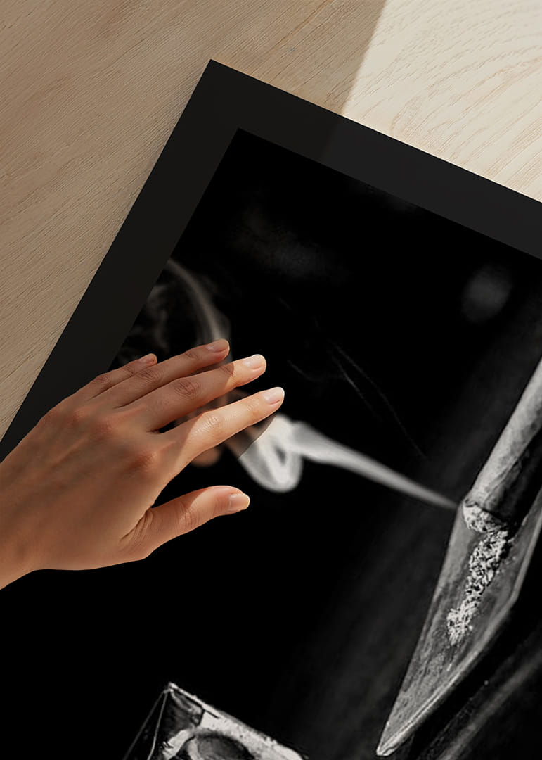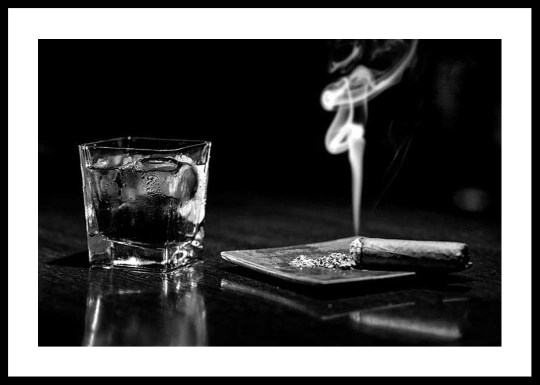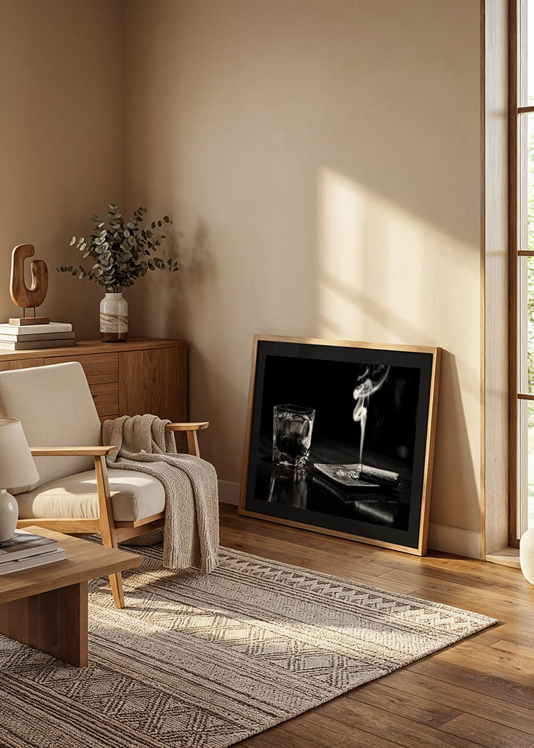 Jääkuutioilla täytetty matala viskilasi seisoo puoliksi savustetun sikarin vieressä tarjottimella, savun kiemurrellessa tummaa taustaa vasten. Mustavalkoinen värimaailma ja yksinkertainen aihe antavat tyylikkään ja hillityn ilmeen. Tämä juliste tuo klassisen tunnelman keittiöön, kotibaariin tai olohuoneeseen.