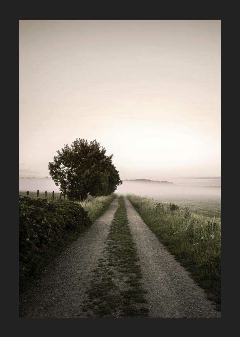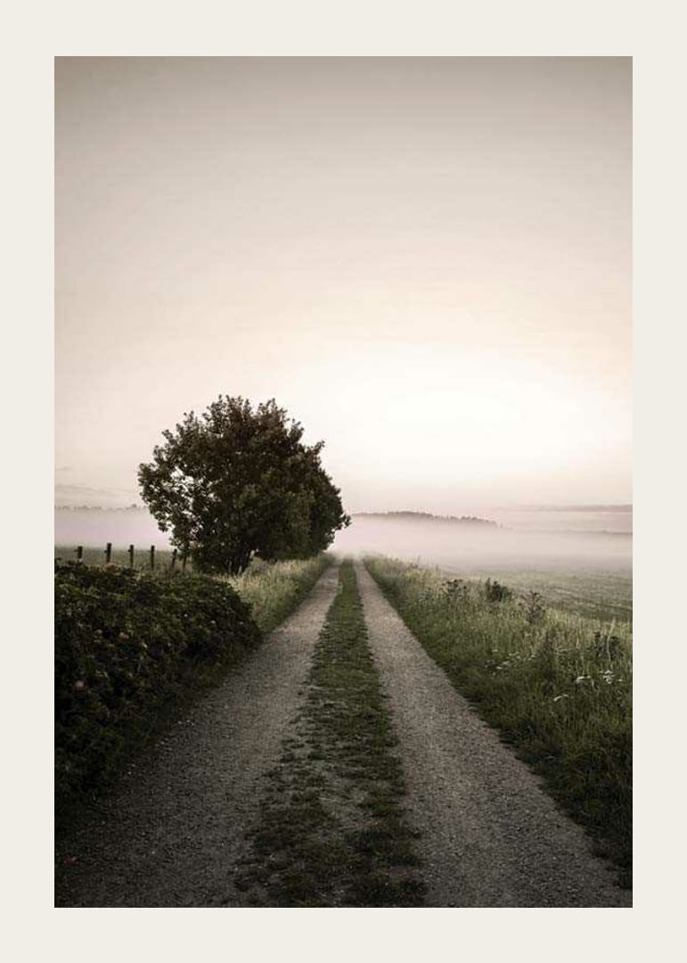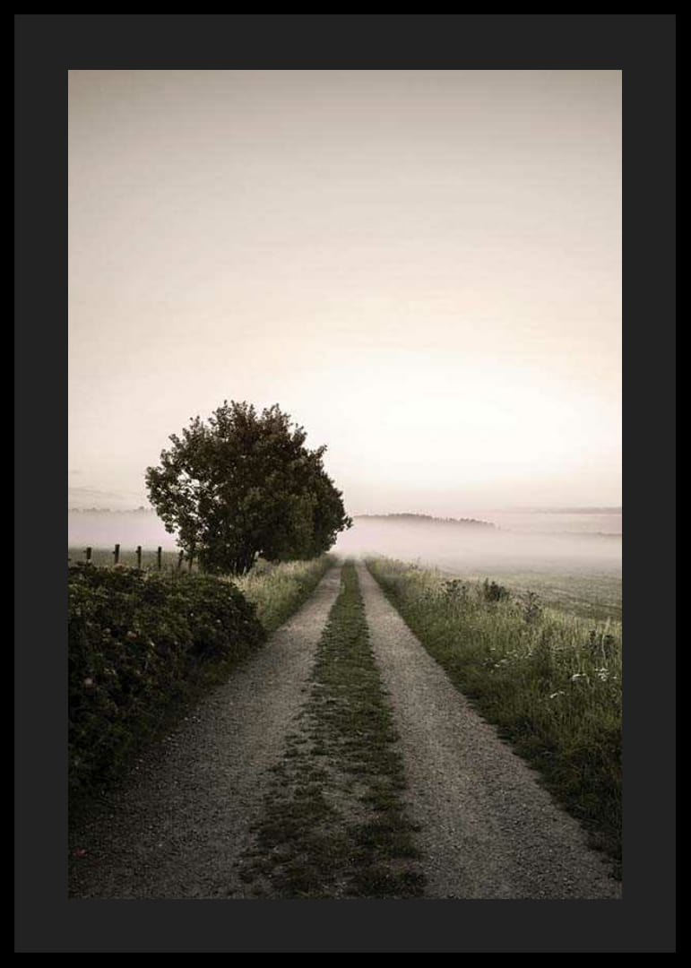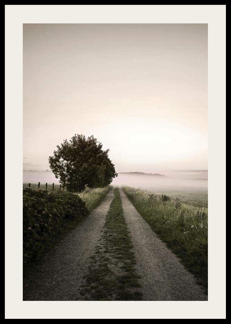 Soratie johtaa pois avoimen maiseman läpi, jota reunustavat ruoho ja pellot, ja maan yllä matalalla leijuu sumu. Vasemmalla yksinäinen puu seisoo kirkasta taivasta vasten aamunkoiton tai hämärän valossa. Tämä juliste hillityillä luonnon sävyillään antaa rauhallisen ja ilmavan vaikutelman esimerkiksi olohuoneeseen tai eteiseen.