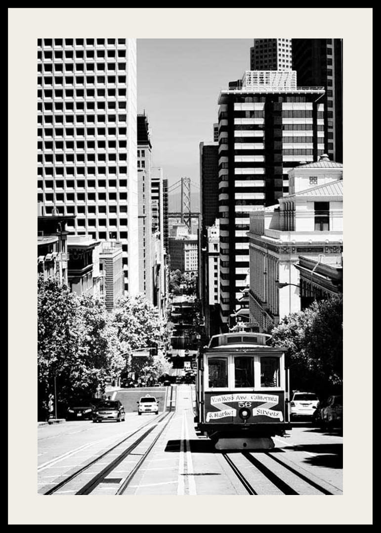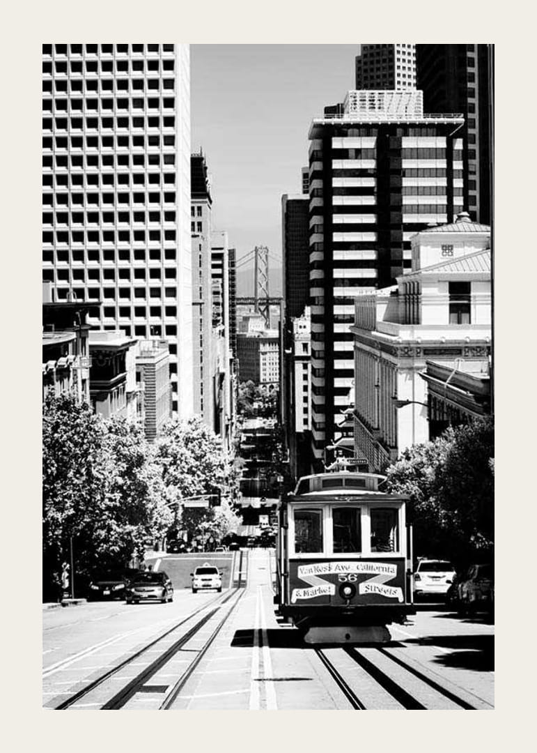 Juliste, jossa on mustavalkoinen valokuva raitiovaunusta, joka rullailee jyrkkää katua pitkin San Franciscon keskustassa korkeiden pilvenpiirtäjien ja vihreiden puiden ympäröimänä. Kaukaisuudessa näkyvät sekä Bay Bridge että Golden Gate Bridge, mikä sijoittaa aiheen ikoniseen Yhdysvaltain kaupunkiin. Mustavalkoinen tyyli antaa julisteelle klassisen ja ajattoman ilmeen, joka sopii sekä eteiseen että olohuoneeseen.