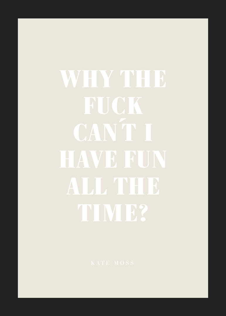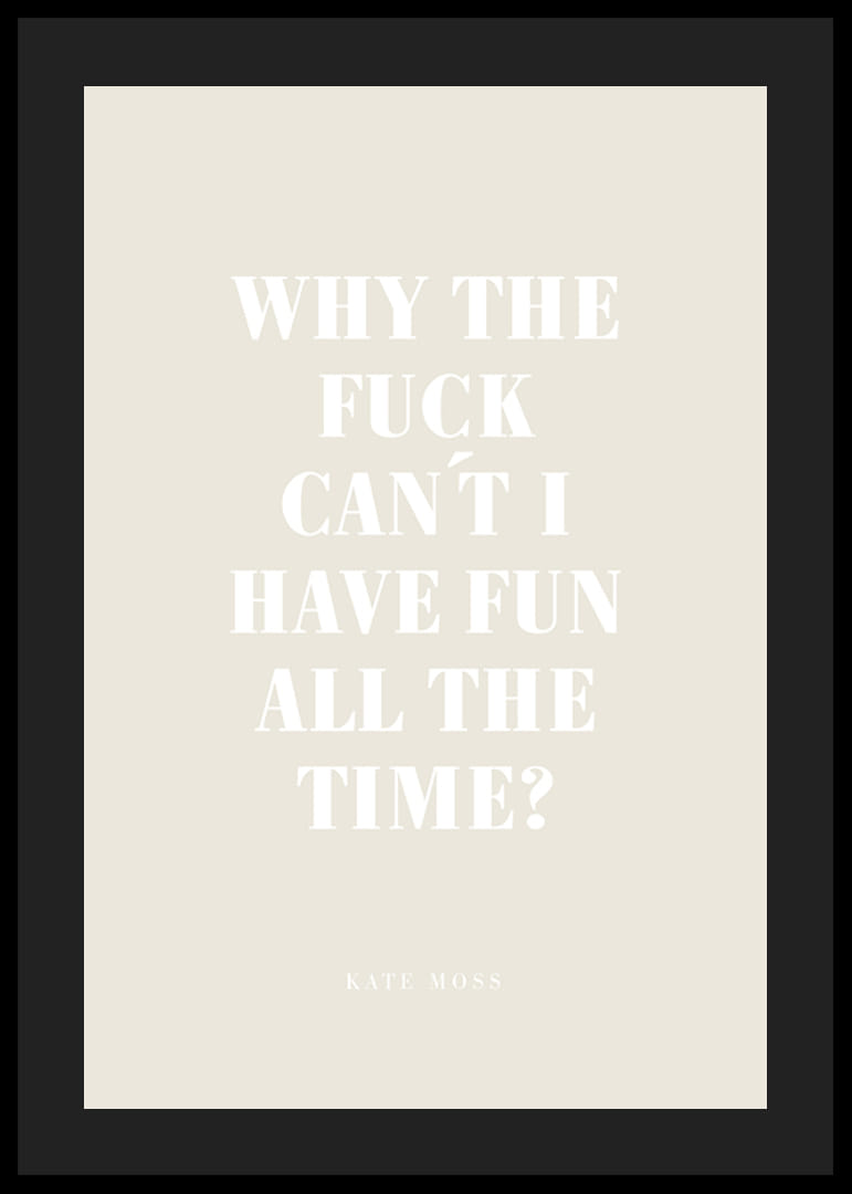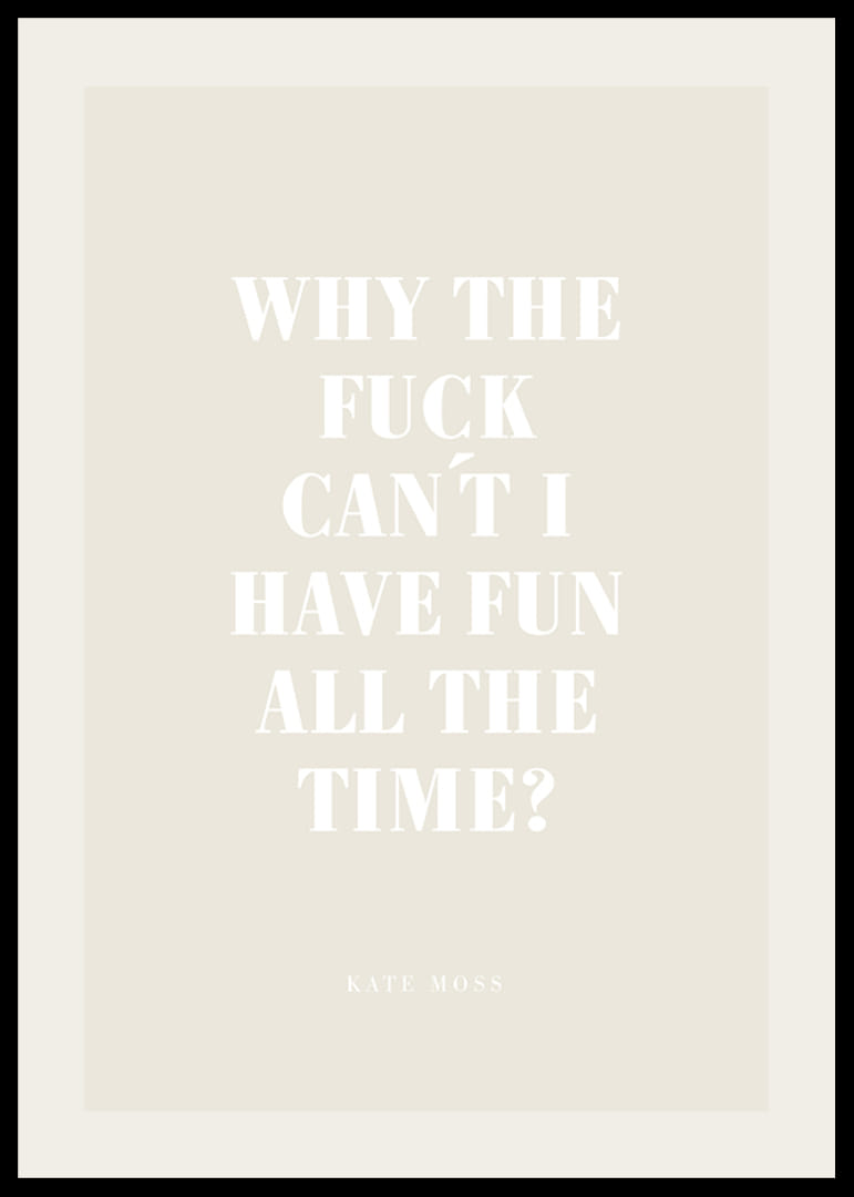 Suuret valkoiset kirjaimet muodostavat hiekanvärisellä, yksivärisellä taustalla olevan sitaatin ”Miksi vitussa en voi pitää hauskaa koko ajan?”. Alareunassa on nimi Kate Moss pienin kirjaimin. Tyylikäs ja minimalistinen muotoilu tekee tästä julisteesta ilmeikkään elementin kotona tai toimistossa.