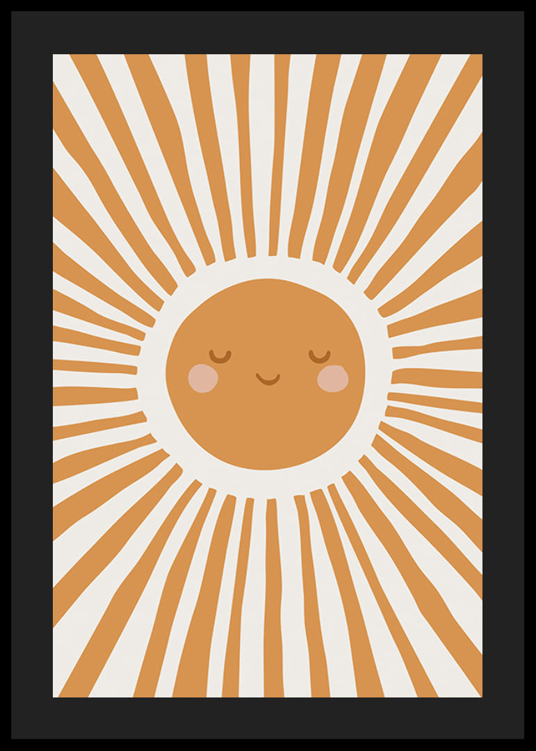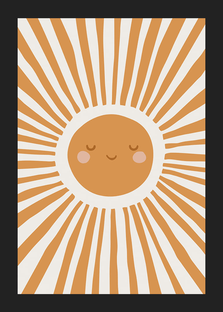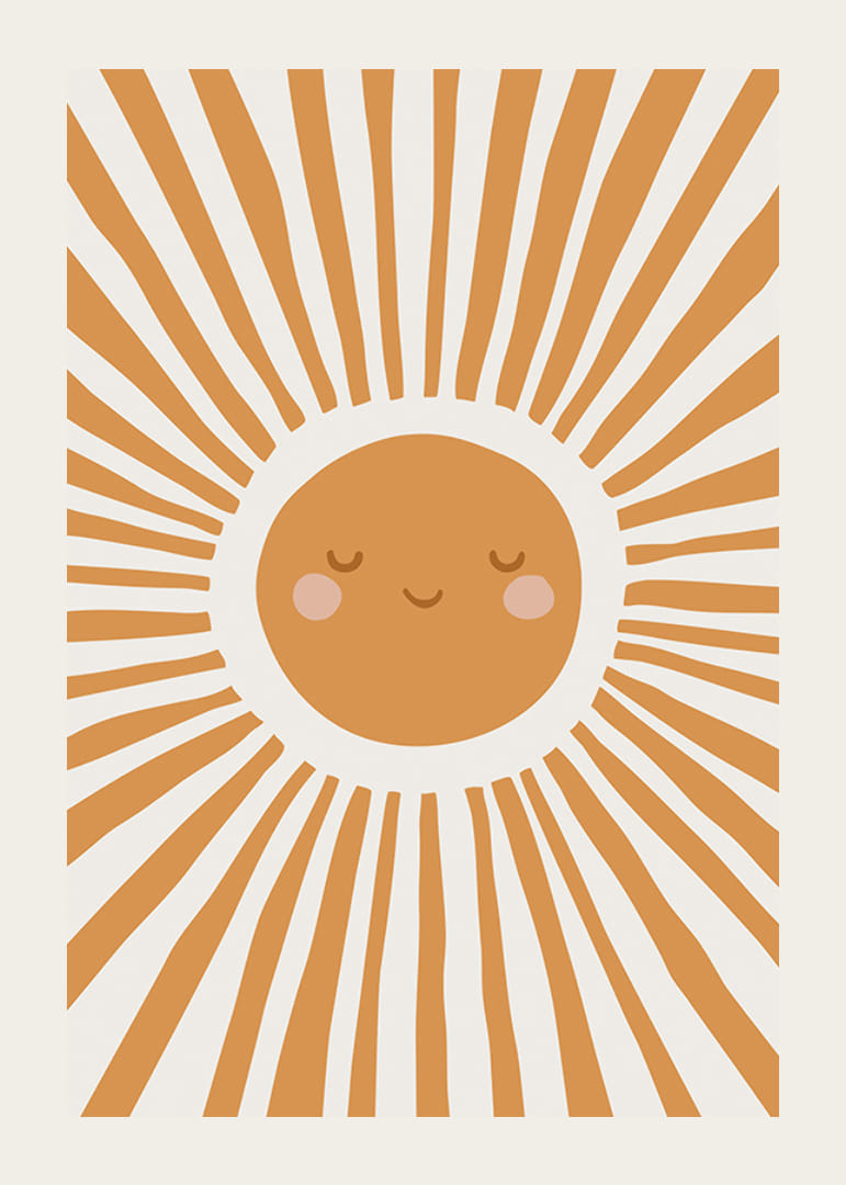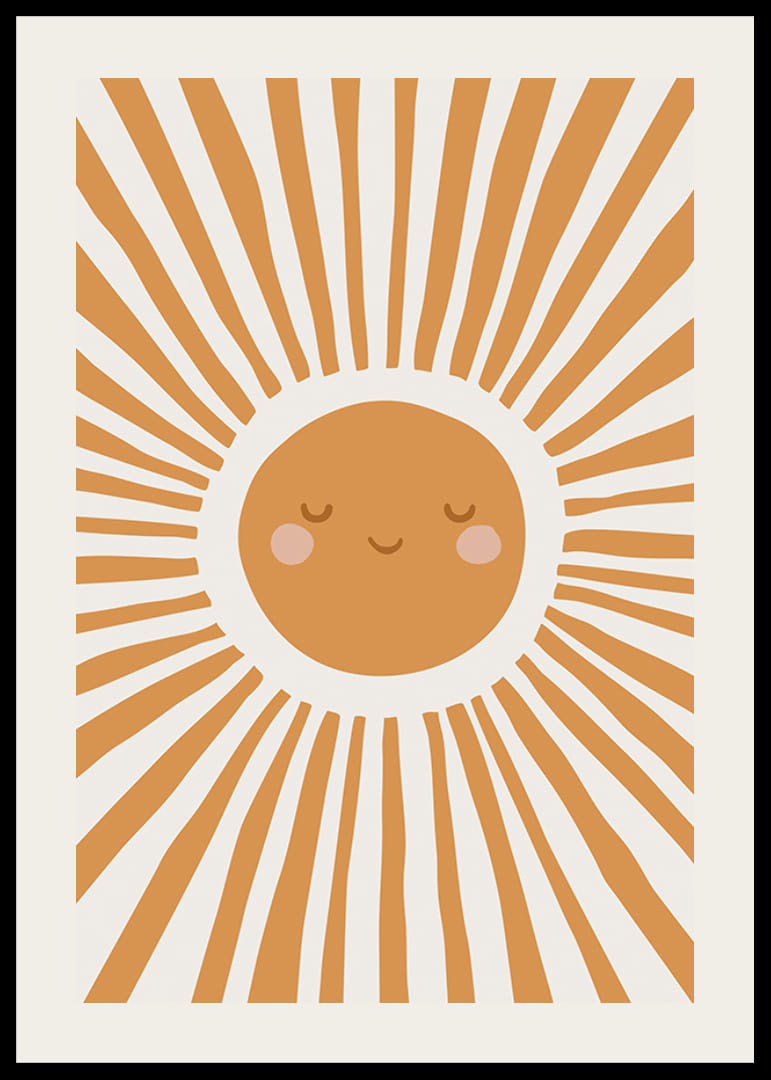 Aiheen keskellä on tyylitelty aurinko lämpimin oranssin sävyin, jolla on ystävälliset kasvot ja ruusunpunaiset posket. Säteet leviävät koko pinnalle graafisena, leikkisänä kuviona. Juliste, joka tuo pehmeää väriä ja iloa lastenhuoneeseen ja sopii hyvin pinnasängyn tai leikkinurkkauksen viereen.