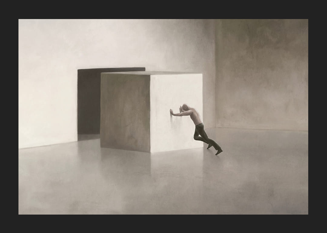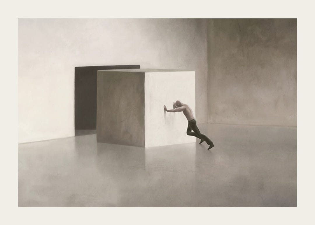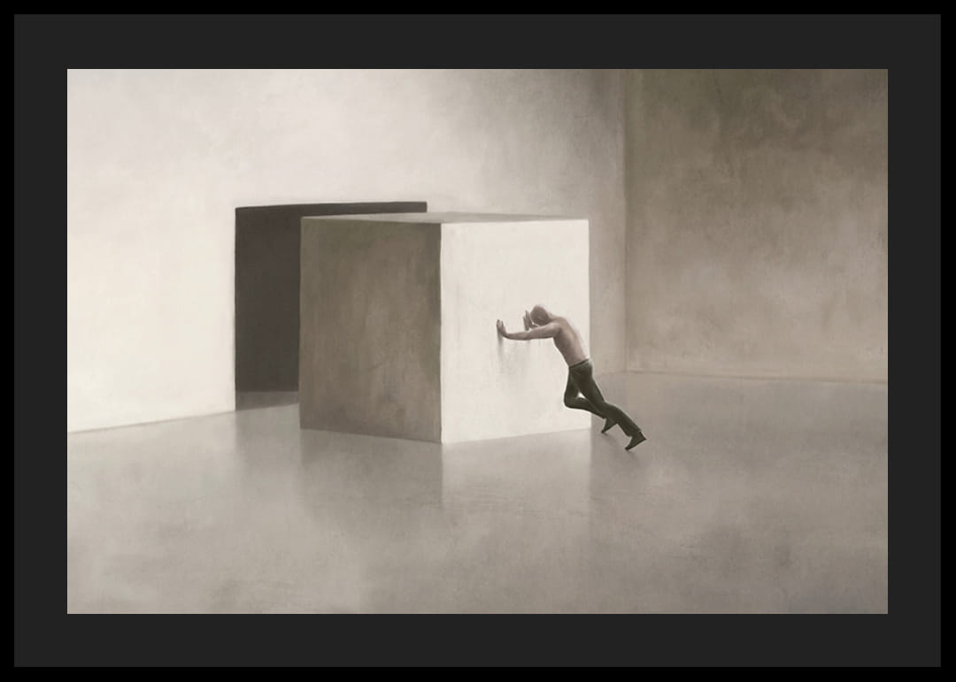 Yksinäinen mies yrittää siirtää massiivista, kirkasta kuutiota lähes tyhjän, harmaanbeigen sävyisen huoneen läpi. Kuution takana seinässä näkyy tumma aukko, johon muoto mahtuu. Riisuttu motiivi antaa julisteelle modernin ja käsitteellisen tunnelman, ja se sopii hyvin ympäristöihin, joissa pohdintaa ja yksinkertaisuutta arvostetaan.