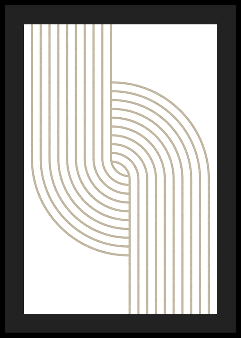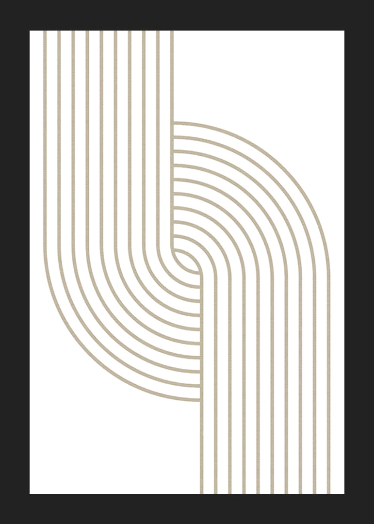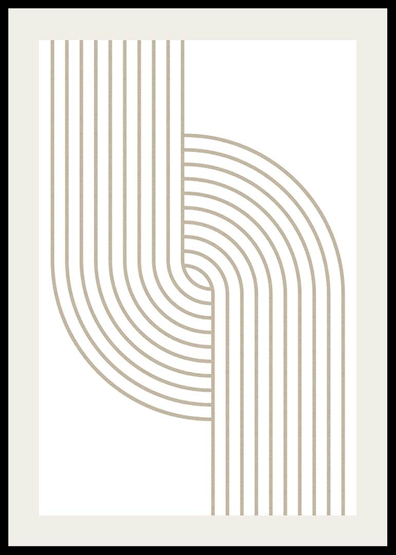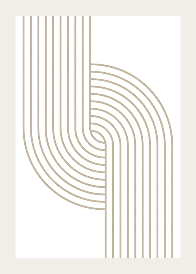 Beigen sävyiset orgaanisesti kaarevat viivat kohtaavat symmetrisessä ja modernissa sommitelmassa valkoista taustaa vasten. Selkeärakenteinen ja rytminen graafinen aihe antaa julisteelle minimalistisen mutta tyylikkään tunnelman. Sopii koristeelliseksi yksityiskohdaksi olohuoneeseen, eteiseen tai työhuoneeseen ja korostaa minimalistista sisustustyyliä.