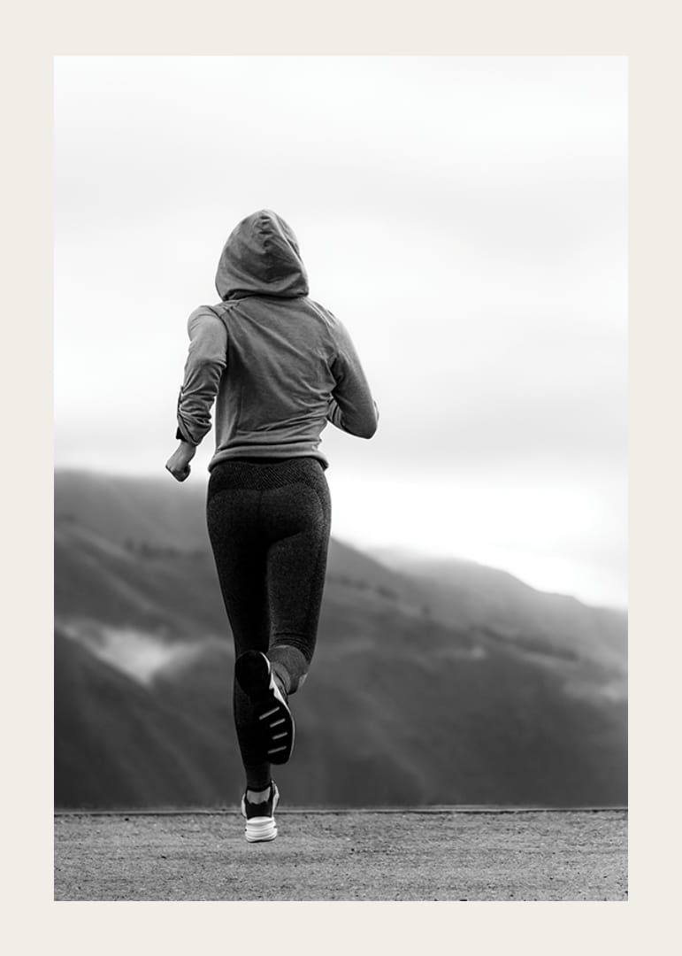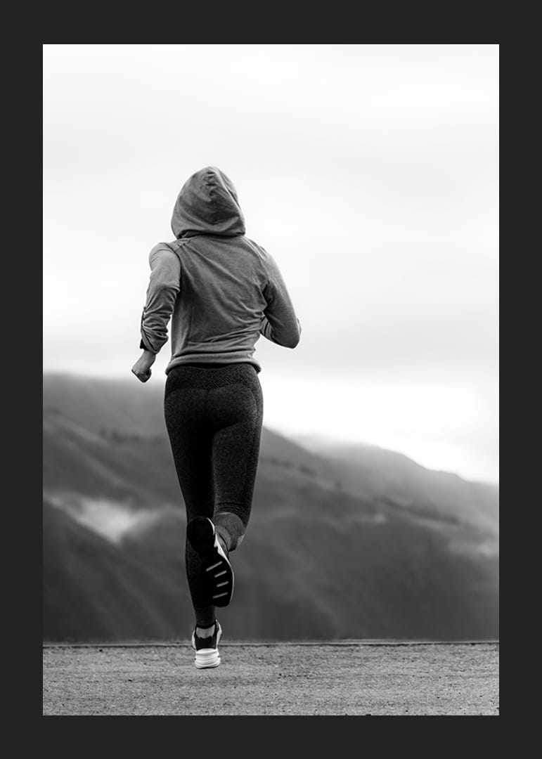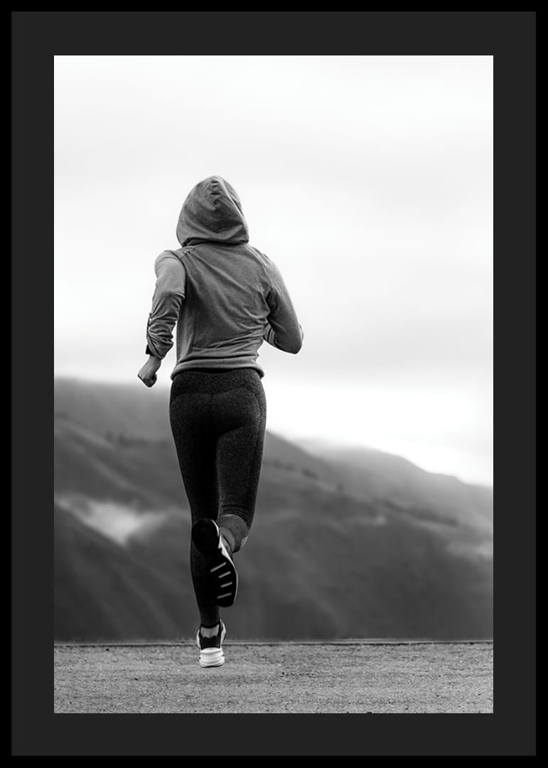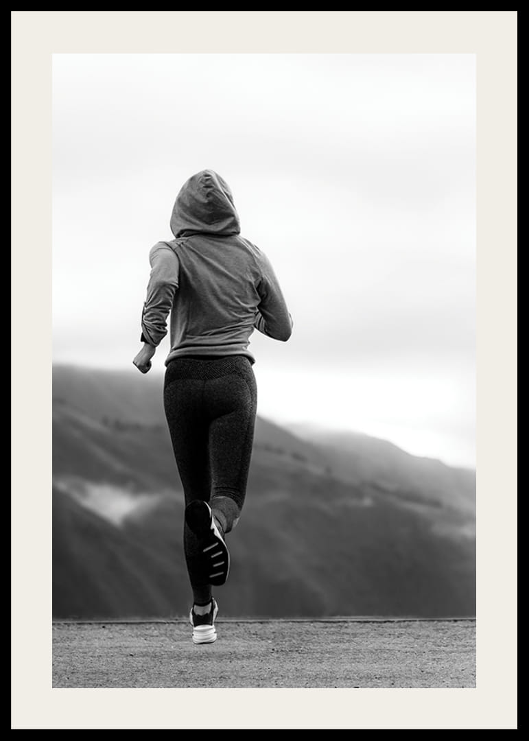 Julisteessa on takaapäin kuvattu nainen treenivaatteissa ja huppu päässään juoksemassa tietä pitkin sumuisten vuorten taustalla. Mustavalkoinen tyyli antaa julisteelle graafisen ja modernin ilmeen. Se sopii kotisalille, eteiseen tai toimistoon, jossa urheilu ja inspiraatio ovat keskipisteenä, ja se vahvistaa huoneen liikkeen tunnetta.