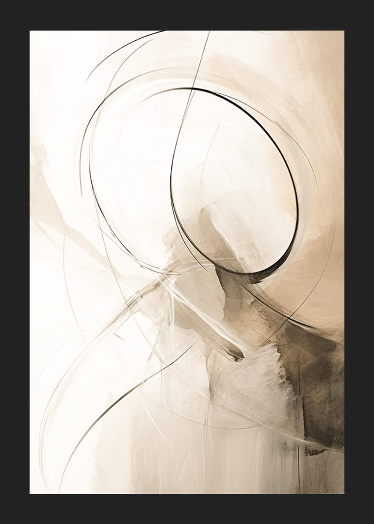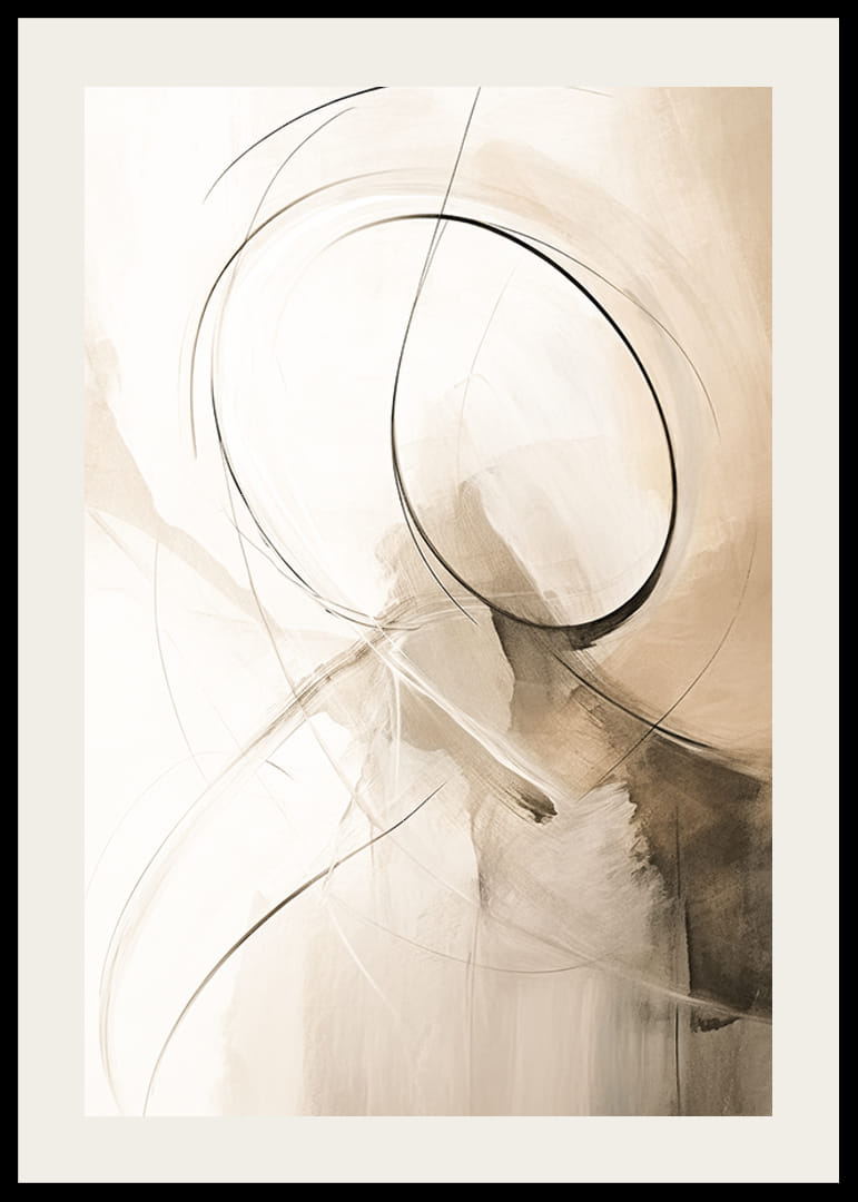 Kelluvat viivat ja pehmeät pyöreät muodot kohtaavat beigen ja ruskean sävyjen sommitelmassa. Pehmeä vesiväritunnelma yhdistettynä ohuisiin mustiin viivoihin antaa tyylikkään ja modernin ilmeen. Tämä juliste sopii moneen huoneeseen ja lisää hienovaraisen taiteellisen tunnelman sekä koti- että työympäristöön.