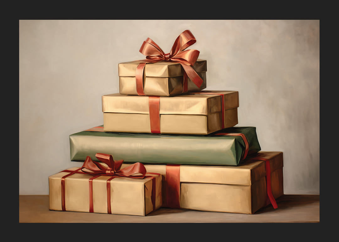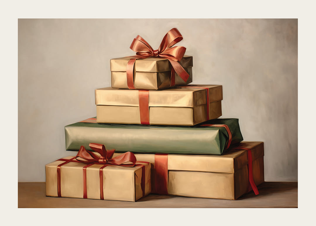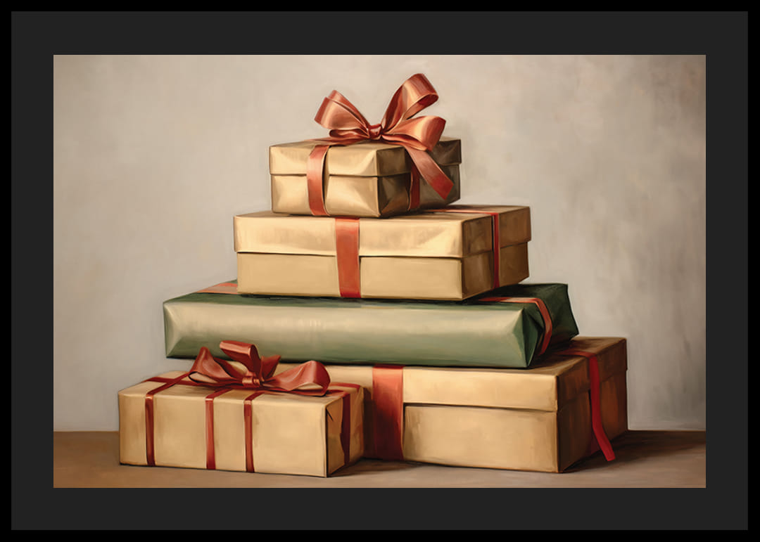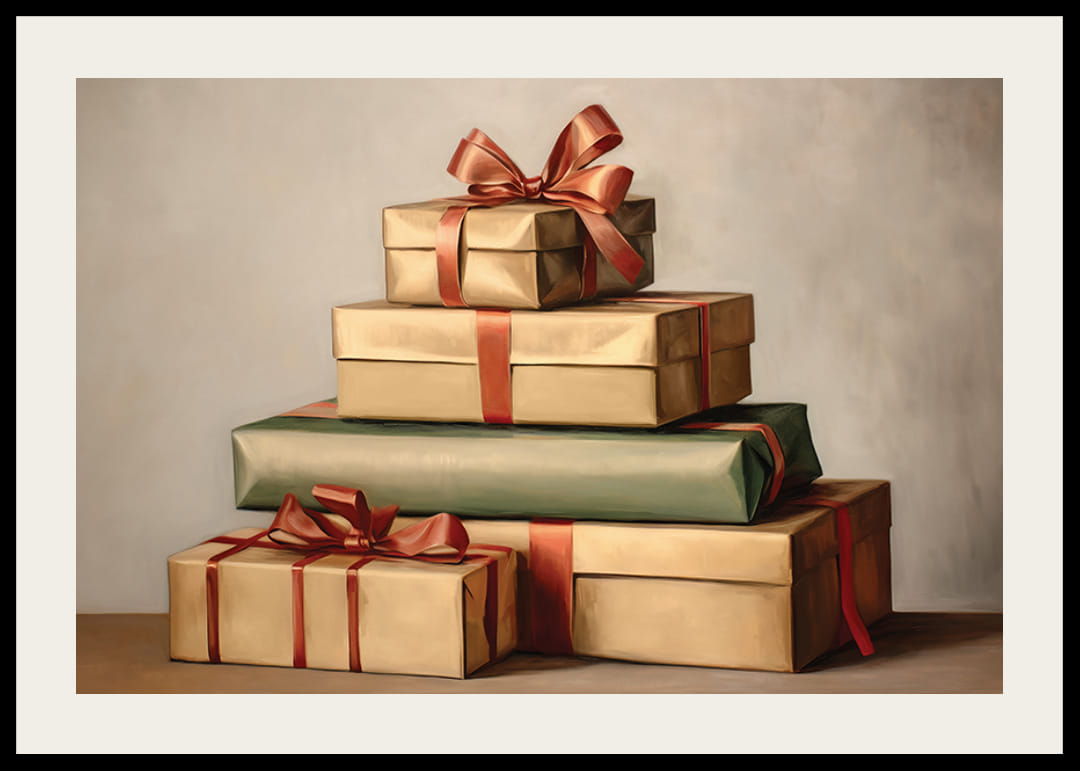 Viisi käärittyä joululahjaa on pinottu päällekkäin pehmeän sävyistä taustaa vasten. Paketit on kääritty beigenväriseen ja vihreään paperiin punaisilla satiininauhoilla ja ruseteilla. Maalattu vesiväritunnelma antaa aiheelle klassisen ilmeen, joka liittyy perinteiseen jouluun. Sopii julisteiksi sekä olohuoneeseen että eteiseen talvikuukausina.
