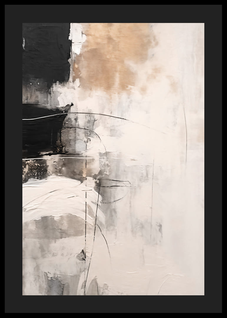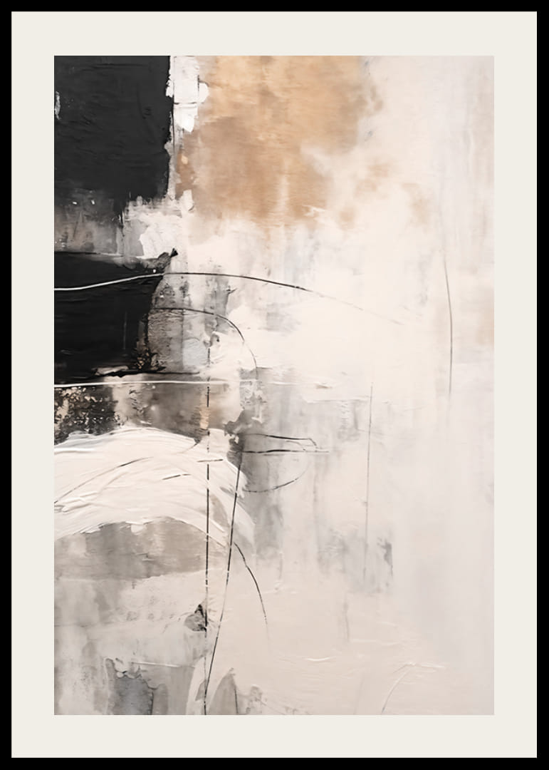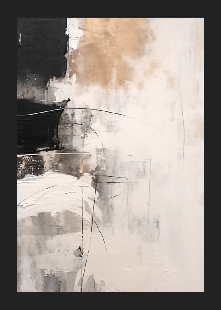 Pehmeät siirtymät beigen, mustan ja harmaan välillä hallitsevat aihetta, ja valkoiset ja vaaleat alueet luovat tasapainoisen kokonaisuuden. Ohuet viivat rikkovat pintoja ja luovat rakennetta. Tämä juliste antaa ilmeikkään mutta hillityn vaikutelman ja sopii hyvin sekä olohuoneisiin että työhuoneisiin, joihin halutaan rauhallinen tunnelma.