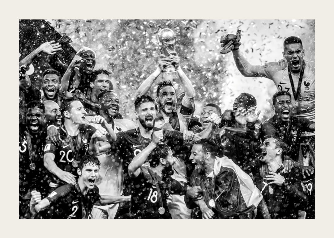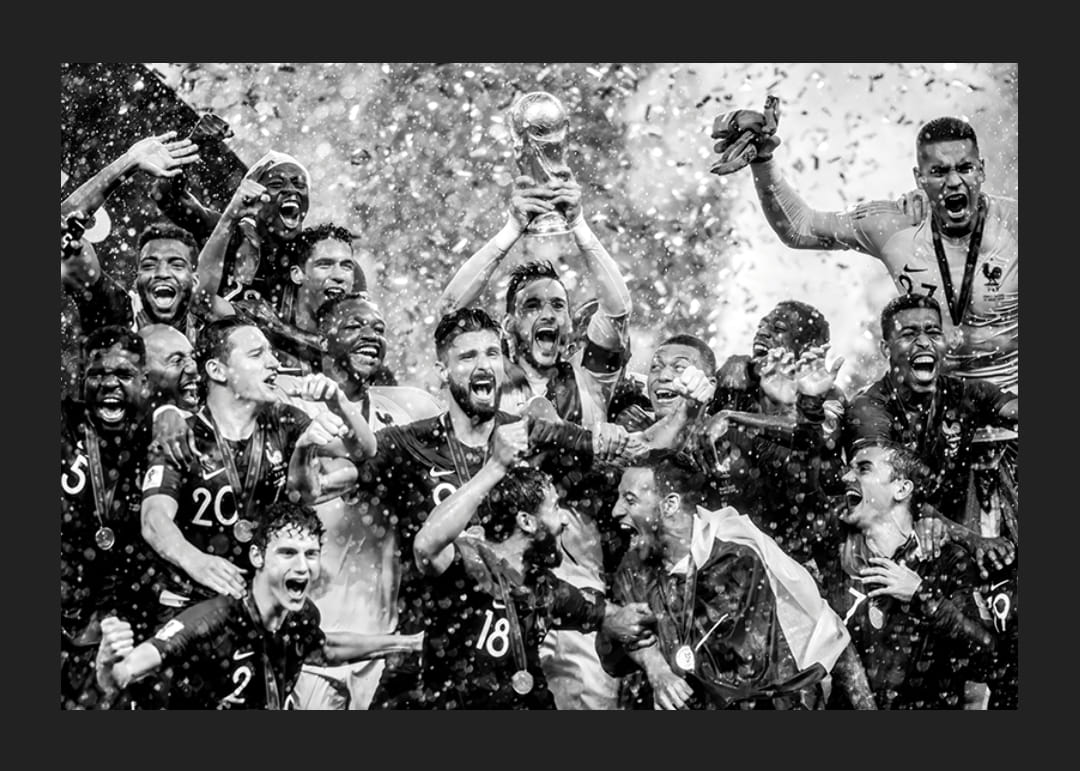 Mustavalkoinen juliste valokuvalla Ranskan jalkapallomaajoukkueesta juhlimassa voittoa vuoden 2018 jalkapallon MM-kisoissa Moskovassa voitettuaan Kroatian.