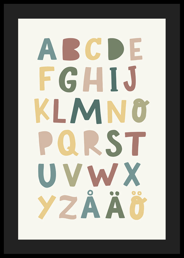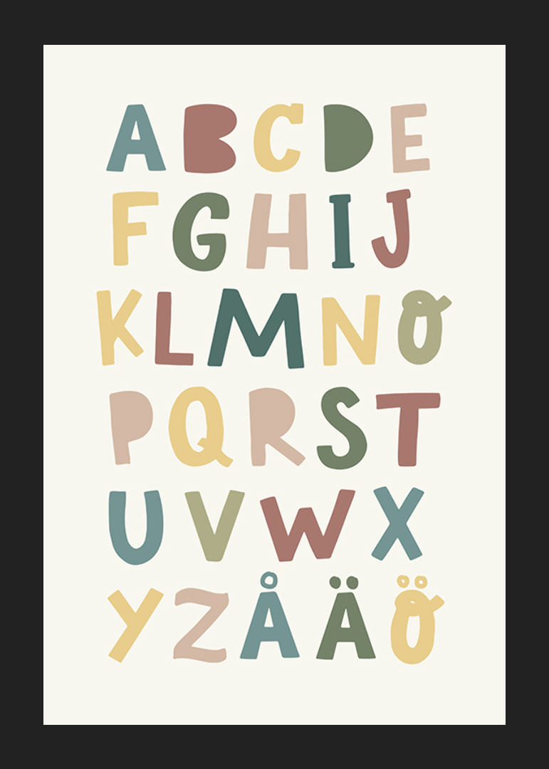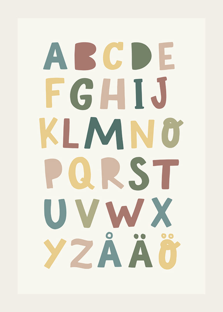 Muuta lastenhuone tällä värikkäällä ja opettavaisella julisteella. Leikkisä muotoilu ja aakkoset pehmeissä, vaimennettuissa sävyissä tekevät oppimisesta hauskaa ja visuaalisesti houkuttelevaa. Täydellinen inspiroimaan lapsessasi uteliaisuutta ja luovuutta joka päivä.