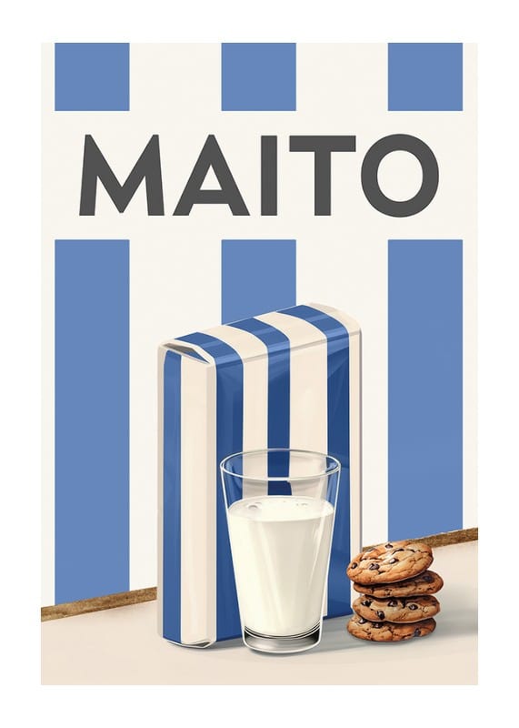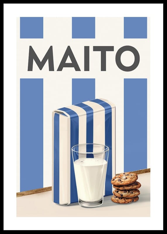 Koe skandinaavinen yksinkertaisuus ja retro viehätys tällä tyylikkäällä julisteella, jossa on maidon akvarellimaalaus. Tämä kuva vangitsee lasillisen kylmää maitoa, tarjoiltuna suklaakeksien kera, klassisilla sinivalkoisilla raidoilla koristetun maitopurkin vieressä. Minimalistinen muotoilu ja harmoninen väripaletti tekevät tästä julisteesta täydellisen yksityiskohdan keittiöön tai ruokasaliin. Kunnianosoitus arjen nautinnoista, joka välittää kodin ja hyvän hetken tunnetta.