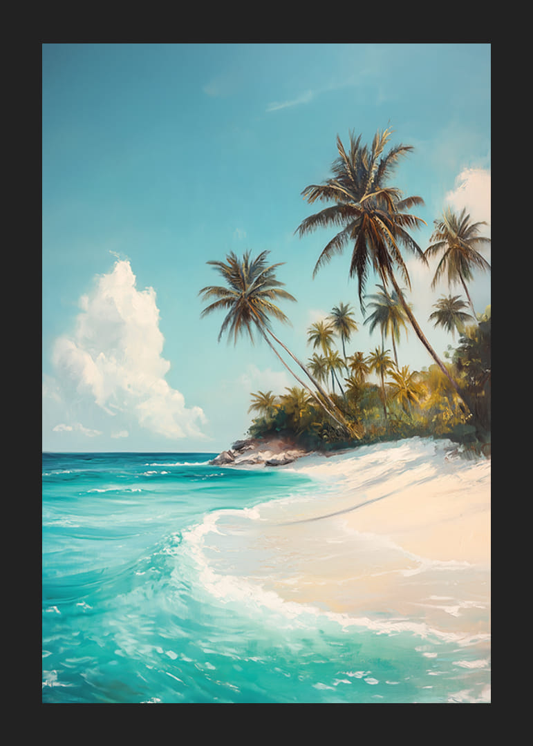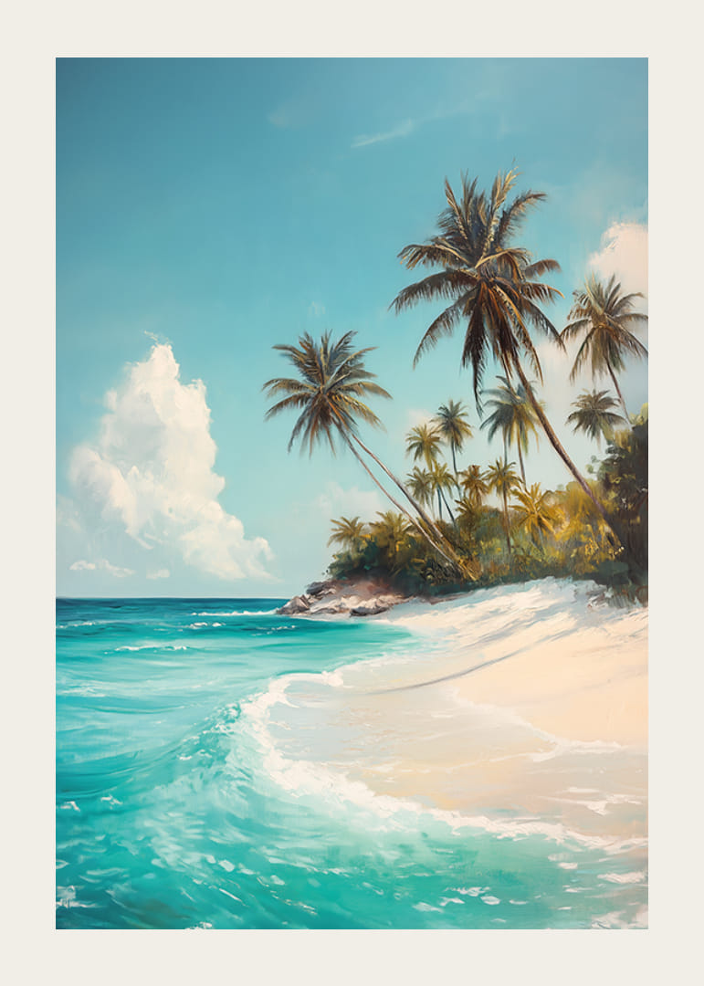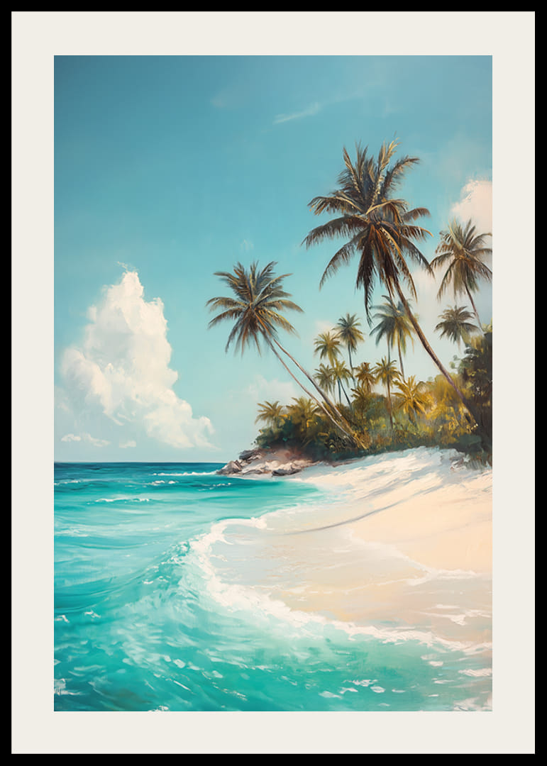 Tämä upea juliste vangitsee trooppisen keitaan olemuksen huojuvilla palmuilla, valkoisella hiekalla ja kristallinkirkkaalla turkoosilla vedellä. Aurinkoinen taivas ja tyyni meri luovat vapauden, rentoutumisen ja ikuisen kesän tunteen.