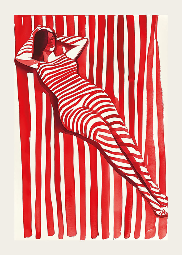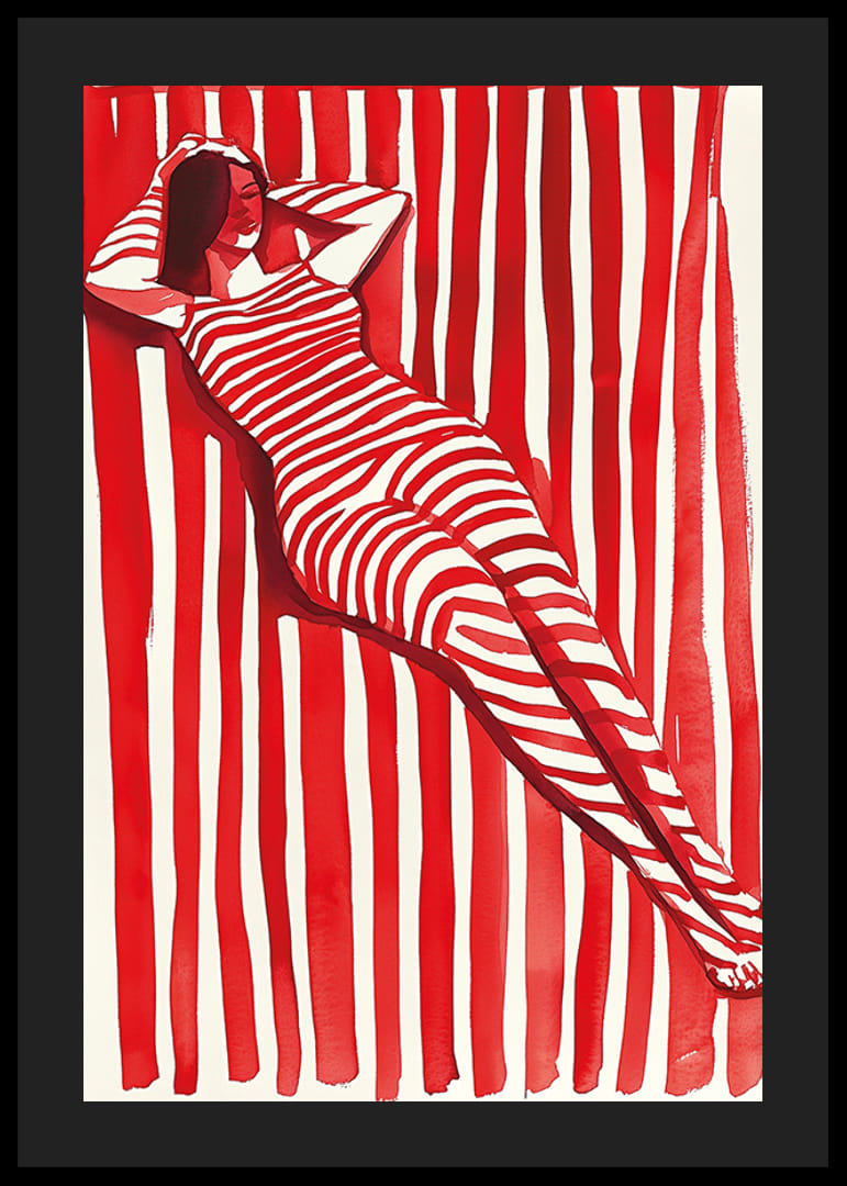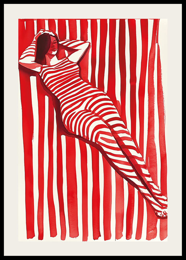 Tutustu taiteen taikuuteen tällä katseenvangitsijalla julisteella, joka vangitsee puhtaan rentoutumisen hetken. Nainen, täydellisessä harmoniassa punavalkoisen raidallisen kuvion kanssa, lepää värimeressä, joka melkein hypnotisoi katsojan. Täydellinen rohkean aksentin luomiseen kotiisi.